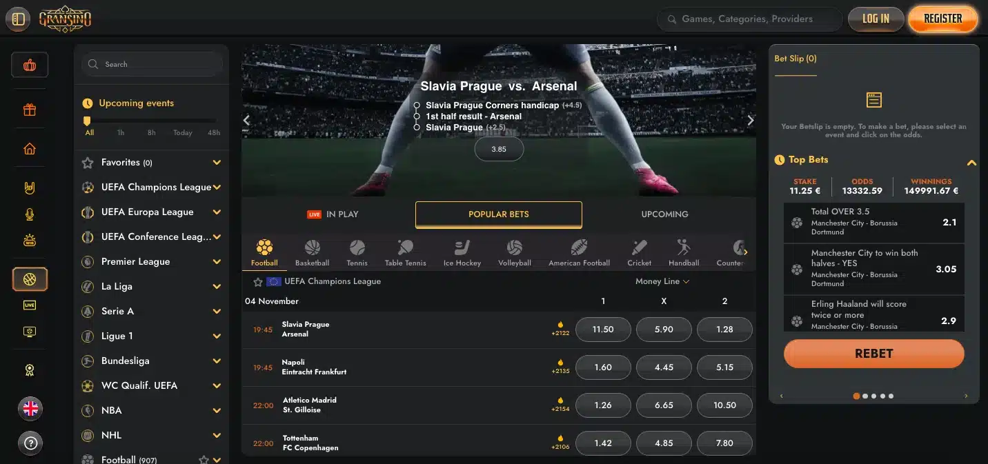 Kasyno Gransino oferuje kompleksową platformę do zakładów sportowych, obejmującą najpopularniejsze dyscypliny na świecie. Na platformie dostępne są zakłady na piłkę nożną, koszykówkę, tenis, tenis stołowy, hokej, siatkówkę, krykiet i wiele innych sportów. Sekcja sportowa jest regularnie aktualizowana i obejmuje zakłady na największe międzynarodowe ligatury i turnieje, takie jak Mistrzostwa Europy UEFA, Liga Europy, Mistrzostwa Afryki i liczne krajowe mistrzostwa z całego świata. Platforma umożliwia graczom umieszczanie różnych typów zakładów, w tym pojedynczych zakładów, multibet i systemowych zakładów z konkurencyjnymi kursami.